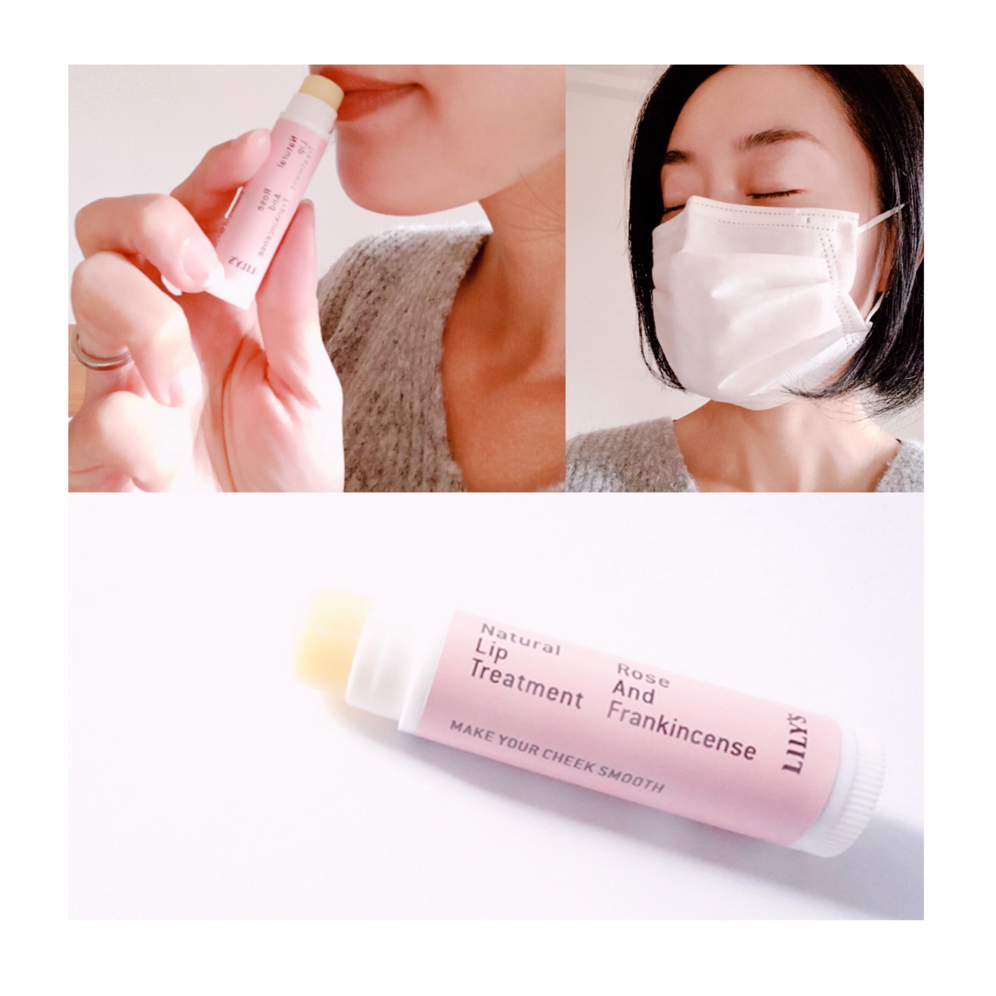 ローズ&フランキンセンスのリップを塗り、マスクをするとより香りが感じられアロマ効果が上がります♡